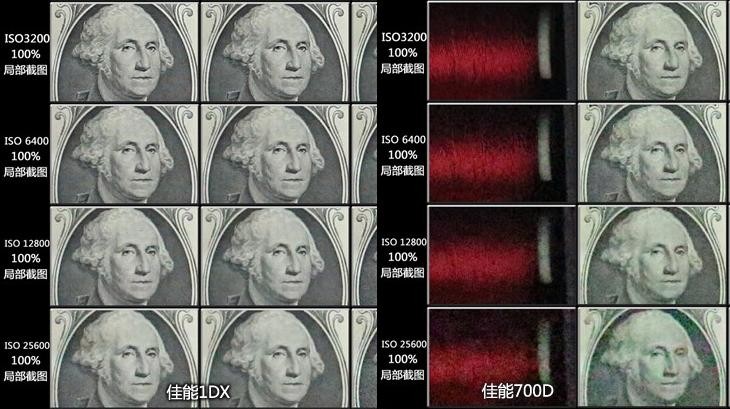 除了画质和虚化效果,全画幅机身还拥有更好的高感光能力。看上图中的对比,我们取出在两款相机评测中的感光度测试,从ISO3200-ISO25600不等,左图是全画幅的佳能1DX,右图是APS-C画幅的佳能700D。两款相机在高感光能力上表现不同。明显右图在这个感光区间内噪点更明显,画面细节也没有左边全画幅来的细腻。所以,全画幅机身在高感光范围内可以更好的控制噪点,让画面变得更纯净细腻。